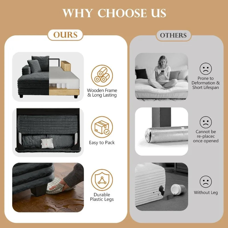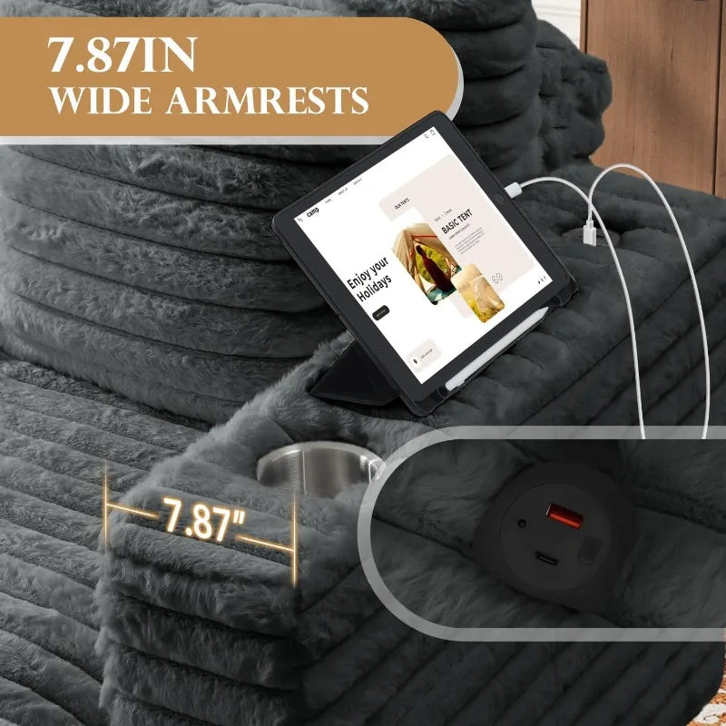 53-inch width and 59.4-inch deep resting area, 7.87 inch wide armrest. USB and Type-C charging ports, cup holders and side pockets.